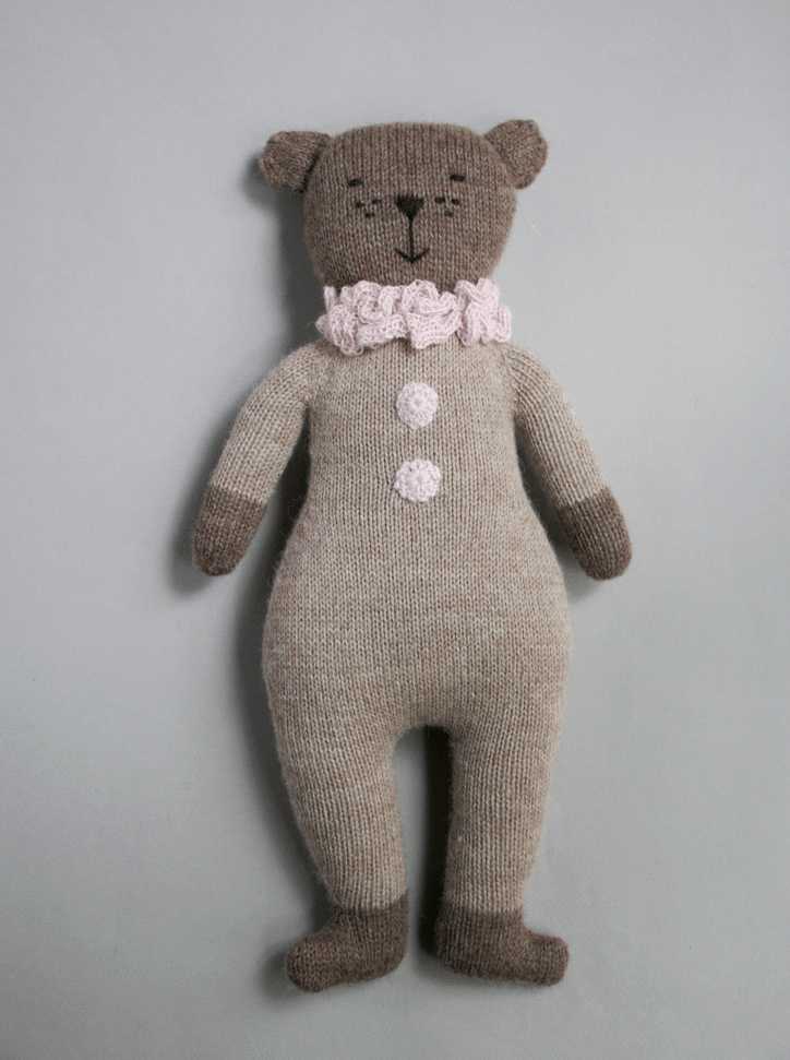 Finished with an embroidered face, crochet buttons, and a ruffled neck.